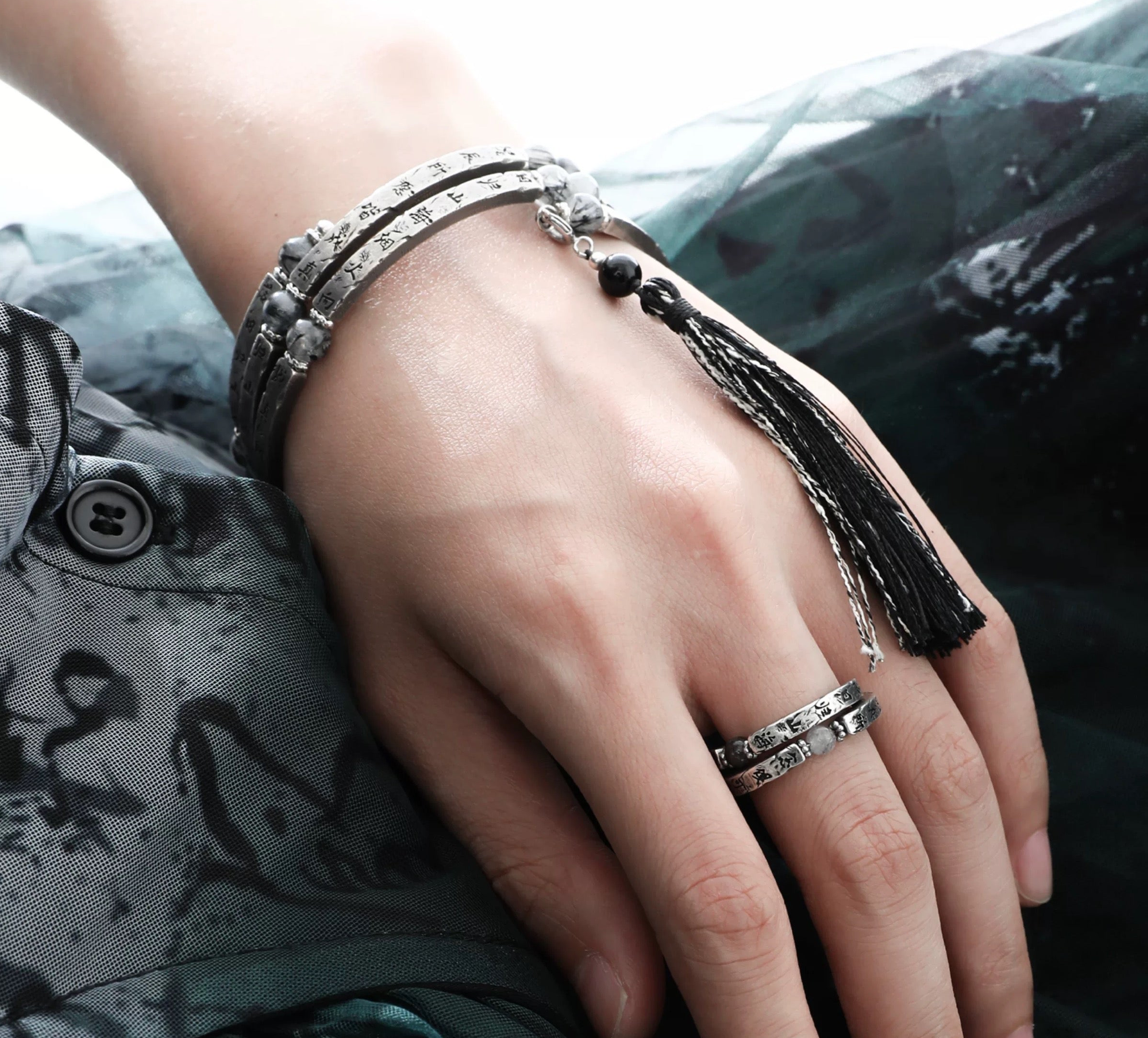 独白系列 - Soliloquy Collection - Oxidized Silver Plate Rutilated Quartz Stack Bracelet (detachable tassel)
